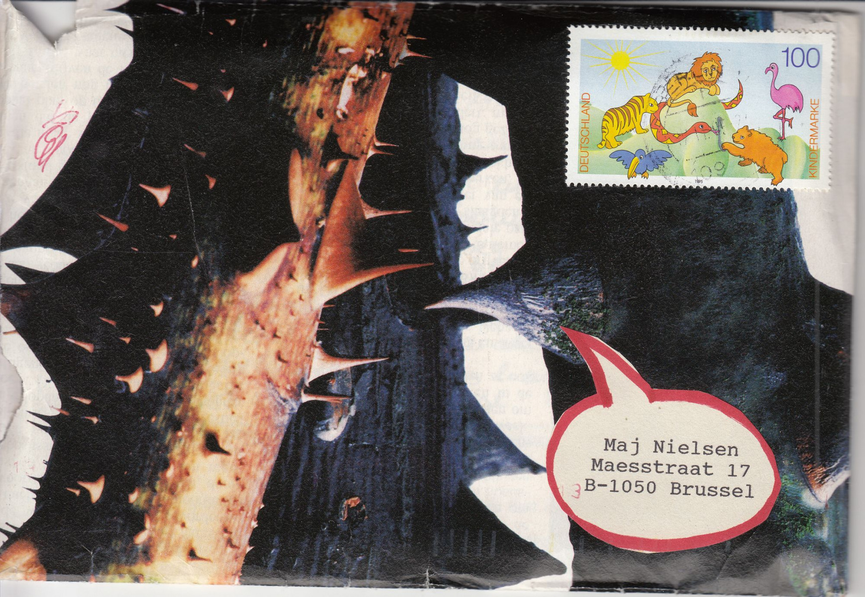 Die Umschläge sind überwiegend farbige Collagen aus Ausrissen aus Hochglanzzeitschriften (unter anderem: Zeit Magazin und FAZ Magazin) sowie von Reklamefotos. Vereinzelt habe ich auch eigene Fotos fotokopiert und aus den Kopien Briefumschläge gestaltet. Ein wiederkehrendes Gestaltungsmerkmal ist eine Comicsprechblase mit Majs Adresse, die dem Mund einer abbildeten Person oder Tieres entspringt. Einige Fotos bzw. Collagen verwiesen anzüglich auf anzügliche sexuelle Praktiken. Vermutlich verweigerte auch deshalb die Belgische Post den Transport und schickte Brief Nr. # an den mich zurück, sodass ich ihn dann in einen neutralen Schutzumschlag stecken und diesen dann ein zweites Mail an Maj schicken musste. Brief Nr. # hat seine aufgeklebte Sprechblase verloren. Um den dekorativen Charakter der Briefumschläge zu erhöhen, habe ich mich bemüht, möglichst immer Sondermarken zu verwenden.