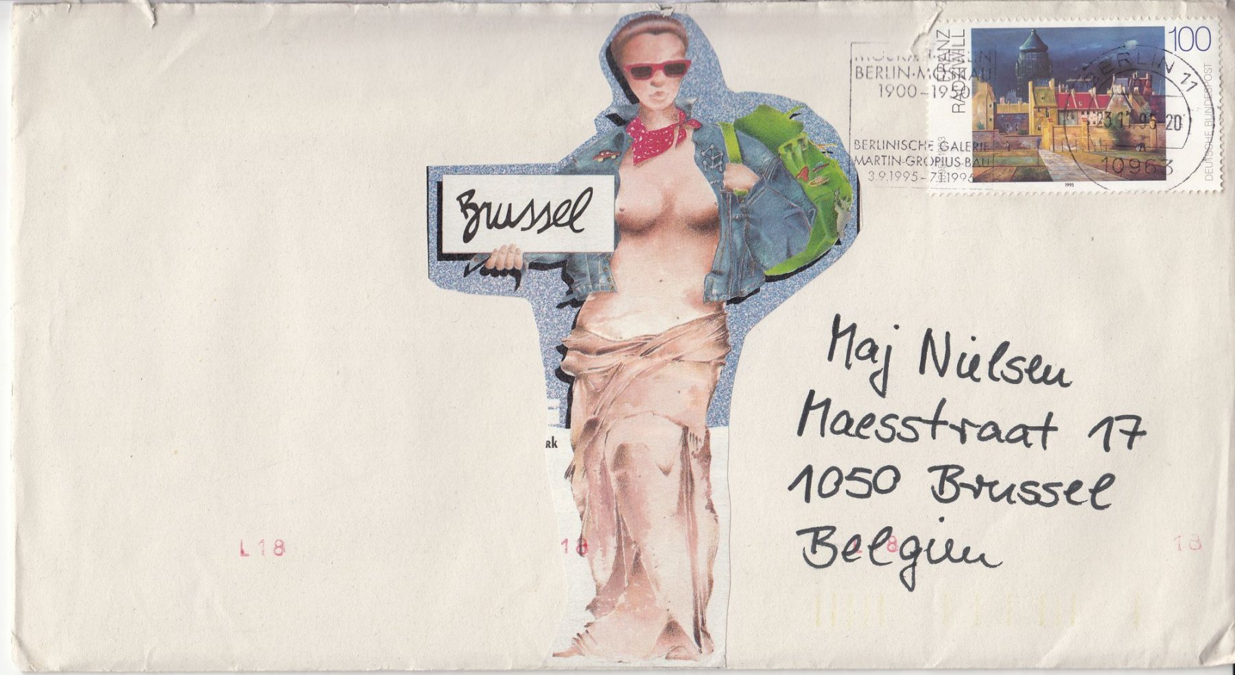 Das hier dargestellte Konvolut „Briefwechsel Berlin – Brüssel / Kopenhagen“ besteht aus einer Auswahl von 52 von mir hergestellten Briefumschlägen. Die Umschläge gehören zu Briefen, die ich frisch verliebt im Zeitraum von August 1995 bis September 1996 an meine damalige Freundin und heutige Ehefrau, Maj Westerfeld, die damals Nielsen hieß, geschickt hatte. Ich lebte schon damals in Berlin und Maj zunächst in Brüssel und später in Kopenhagen.