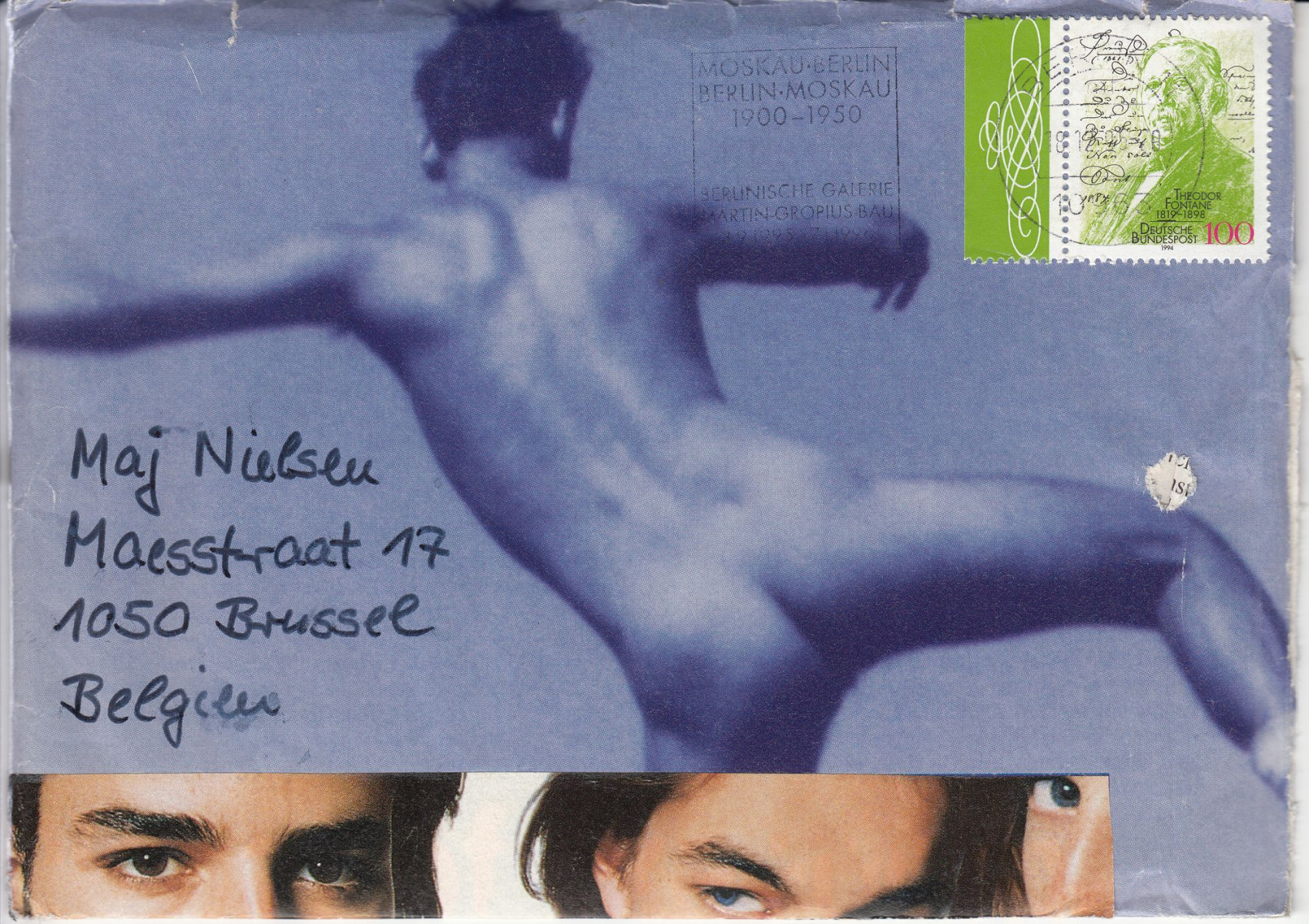 Das hier dargestellte Konvolut „Briefwechsel Berlin – Brüssel / Kopenhagen“ besteht aus einer Auswahl von 52 von mir hergestellten Briefumschlägen. Die Umschläge gehören zu Briefen, die ich frisch verliebt im Zeitraum von August 1995 bis September 1996 an meine damalige Freundin und heutige Ehefrau, Maj Westerfeld, die damals Nielsen hieß, geschickt hatte. Ich lebte schon damals in Berlin und Maj zunächst in Brüssel und später in Kopenhagen.