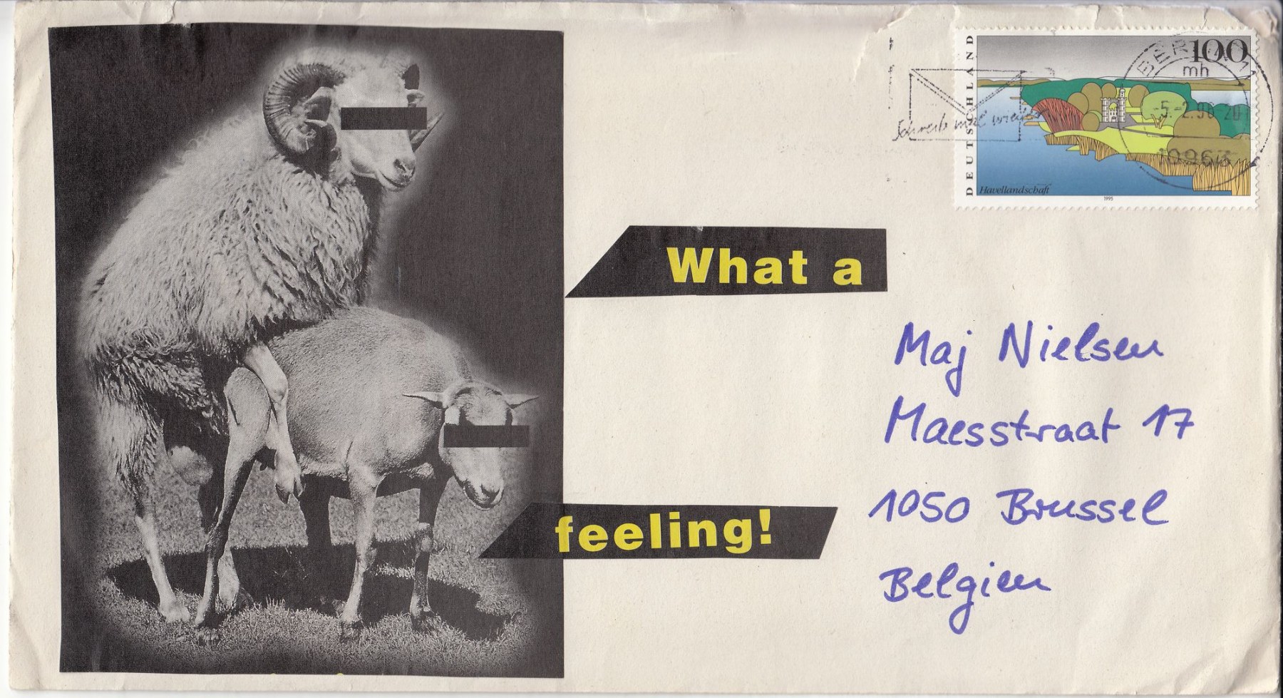 Das hier dargestellte Konvolut „Briefwechsel Berlin – Brüssel / Kopenhagen“ besteht aus einer Auswahl von 52 von mir hergestellten Briefumschlägen. Die Umschläge gehören zu Briefen, die ich frisch verliebt im Zeitraum von August 1995 bis September 1996 an meine damalige Freundin und heutige Ehefrau, Maj Westerfeld, die damals Nielsen hieß, geschickt hatte. Ich lebte schon damals in Berlin und Maj zunächst in Brüssel und später in Kopenhagen.