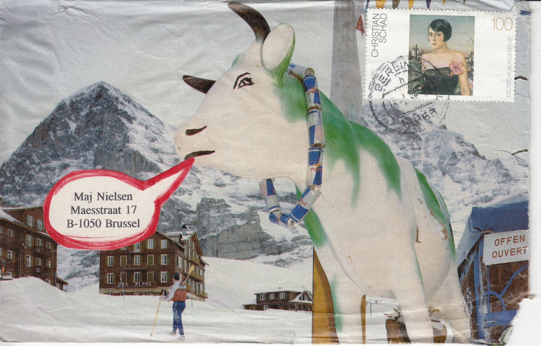 Die Umschläge sind überwiegend farbige Collagen aus Ausrissen aus Hochglanzzeitschriften (unter anderem: Zeit Magazin und FAZ Magazin) sowie von Reklamefotos. Vereinzelt habe ich auch eigene Fotos fotokopiert und aus den Kopien Briefumschläge gestaltet. Ein wiederkehrendes Gestaltungsmerkmal ist eine Comicsprechblase mit Majs Adresse, die dem Mund einer abbildeten Person oder Tieres entspringt. Einige Fotos bzw. Collagen verwiesen anzüglich auf anzügliche sexuelle Praktiken. Vermutlich verweigerte auch deshalb die Belgische Post den Transport und schickte Brief Nr. # an den mich zurück, sodass ich ihn dann in einen neutralen Schutzumschlag stecken und diesen dann ein zweites Mail an Maj schicken musste. Brief Nr. # hat seine aufgeklebte Sprechblase verloren. Um den dekorativen Charakter der Briefumschläge zu erhöhen, habe ich mich bemüht, möglichst immer Sondermarken zu verwenden.