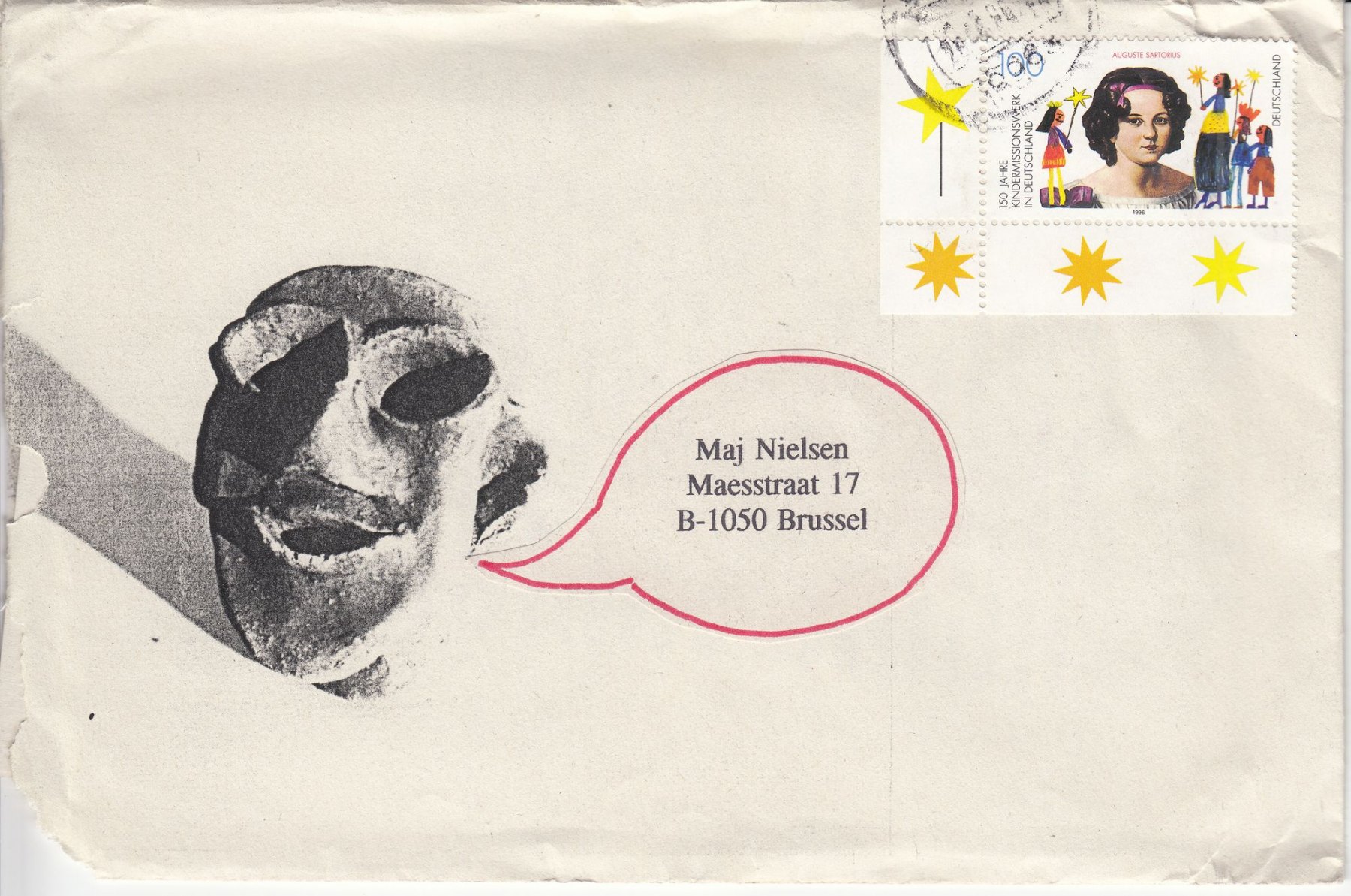 Die Umschläge sind überwiegend farbige Collagen aus Ausrissen aus Hochglanzzeitschriften (unter anderem: Zeit Magazin und FAZ Magazin) sowie von Reklamefotos. Vereinzelt habe ich auch eigene Fotos fotokopiert und aus den Kopien Briefumschläge gestaltet. Ein wiederkehrendes Gestaltungsmerkmal ist eine Comicsprechblase mit Majs Adresse, die dem Mund einer abbildeten Person oder Tieres entspringt. Einige Fotos bzw. Collagen verwiesen anzüglich auf anzügliche sexuelle Praktiken. Vermutlich verweigerte auch deshalb die Belgische Post den Transport und schickte Brief Nr. # an den mich zurück, sodass ich ihn dann in einen neutralen Schutzumschlag stecken und diesen dann ein zweites Mail an Maj schicken musste. Brief Nr. # hat seine aufgeklebte Sprechblase verloren. Um den dekorativen Charakter der Briefumschläge zu erhöhen, habe ich mich bemüht, möglichst immer Sondermarken zu verwenden.