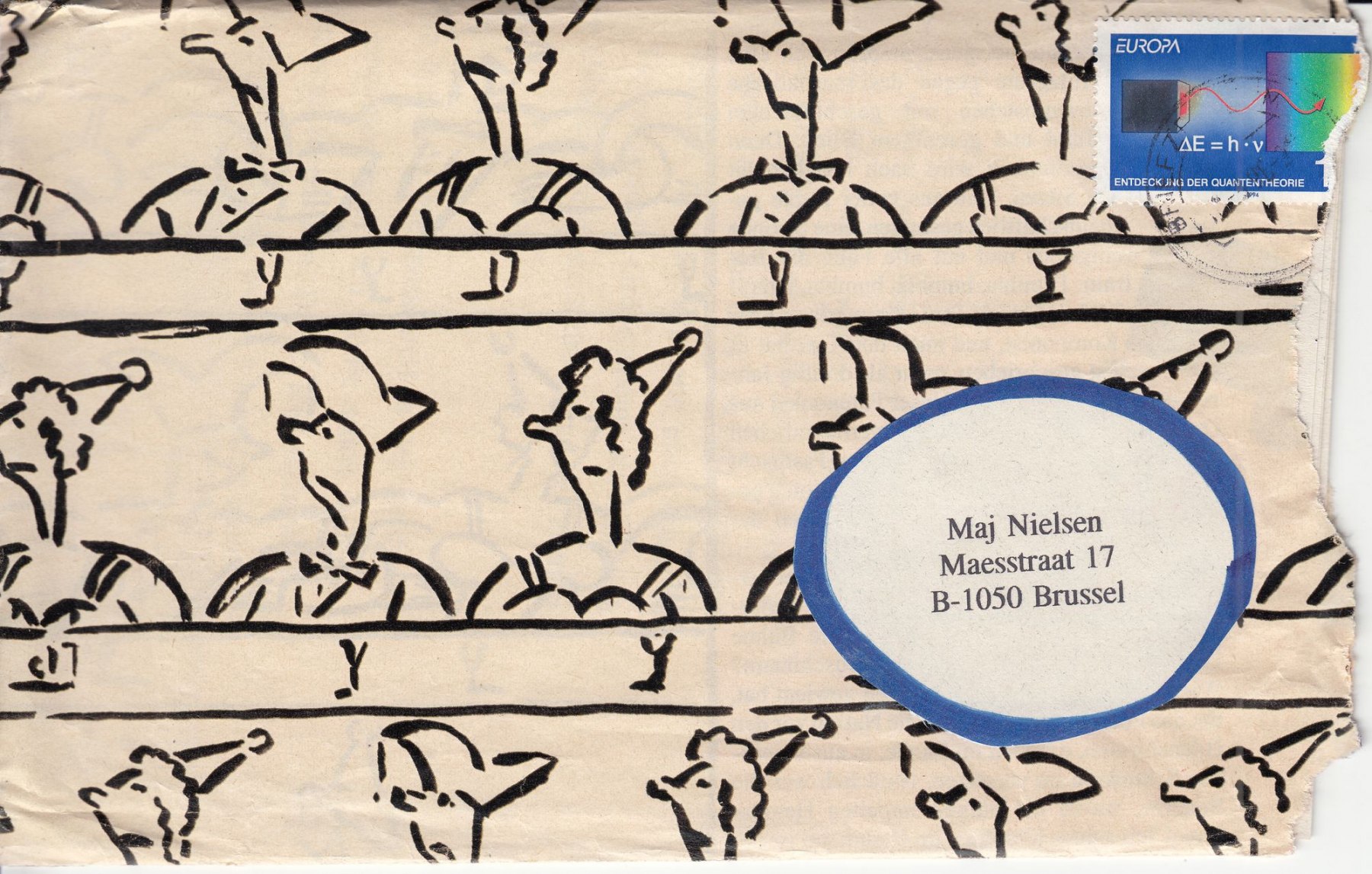 Das hier dargestellte Konvolut „Briefwechsel Berlin – Brüssel / Kopenhagen“ besteht aus einer Auswahl von 52 von mir hergestellten Briefumschlägen. Die Umschläge gehören zu Briefen, die ich frisch verliebt im Zeitraum von August 1995 bis September 1996 an meine damalige Freundin und heutige Ehefrau, Maj Westerfeld, die damals Nielsen hieß, geschickt hatte. Ich lebte schon damals in Berlin und Maj zunächst in Brüssel und später in Kopenhagen.