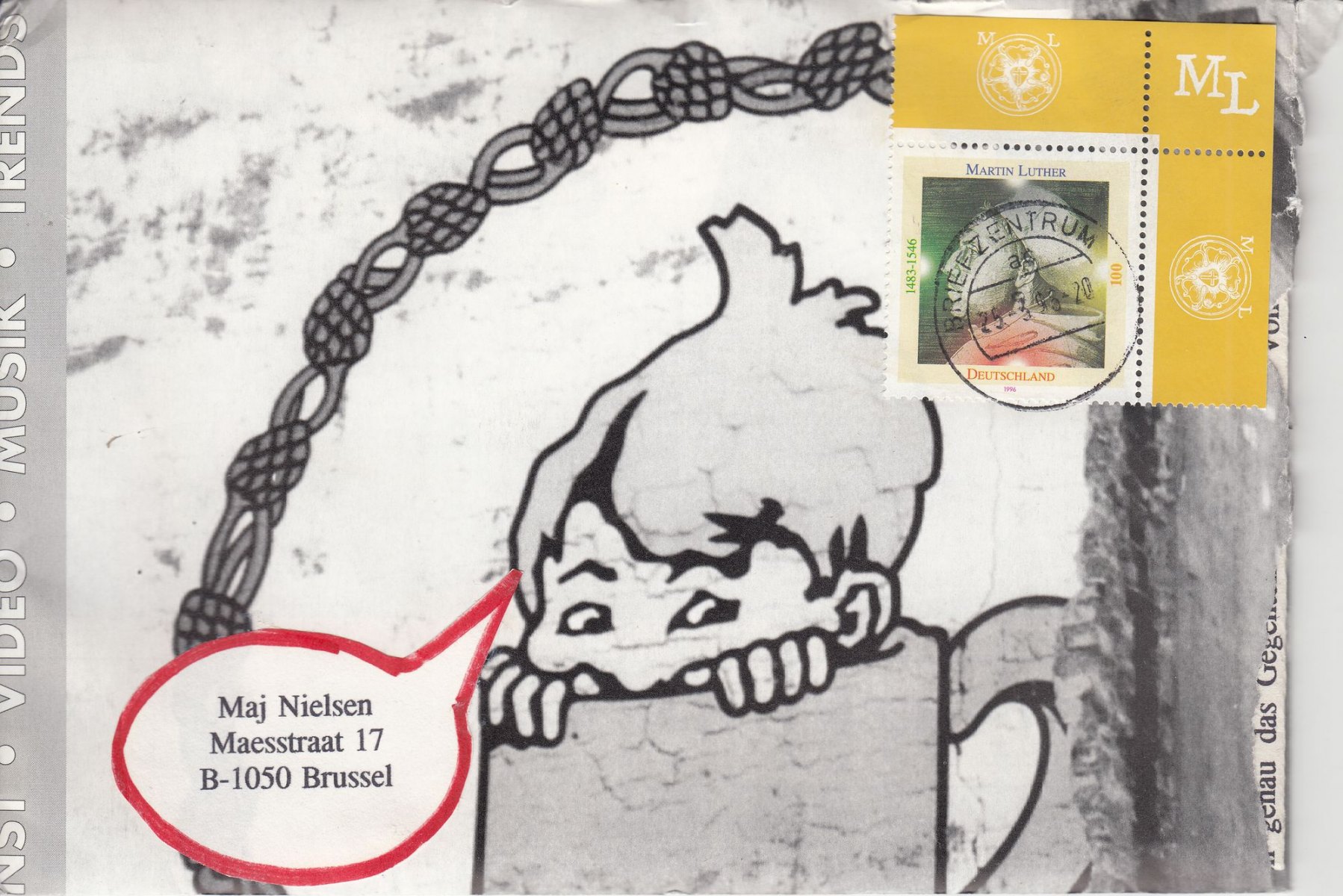Das hier dargestellte Konvolut „Briefwechsel Berlin – Brüssel / Kopenhagen“ besteht aus einer Auswahl von 52 von mir hergestellten Briefumschlägen. Die Umschläge gehören zu Briefen, die ich frisch verliebt im Zeitraum von August 1995 bis September 1996 an meine damalige Freundin und heutige Ehefrau, Maj Westerfeld, die damals Nielsen hieß, geschickt hatte. Ich lebte schon damals in Berlin und Maj zunächst in Brüssel und später in Kopenhagen.