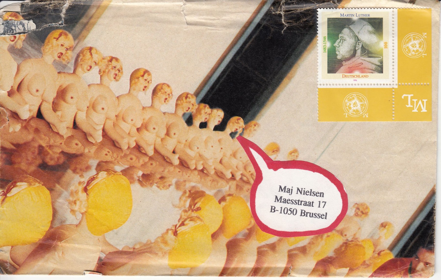 Das hier dargestellte Konvolut „Briefwechsel Berlin – Brüssel / Kopenhagen“ besteht aus einer Auswahl von 52 von mir hergestellten Briefumschlägen. Die Umschläge gehören zu Briefen, die ich frisch verliebt im Zeitraum von August 1995 bis September 1996 an meine damalige Freundin und heutige Ehefrau, Maj Westerfeld, die damals Nielsen hieß, geschickt hatte. Ich lebte schon damals in Berlin und Maj zunächst in Brüssel und später in Kopenhagen.