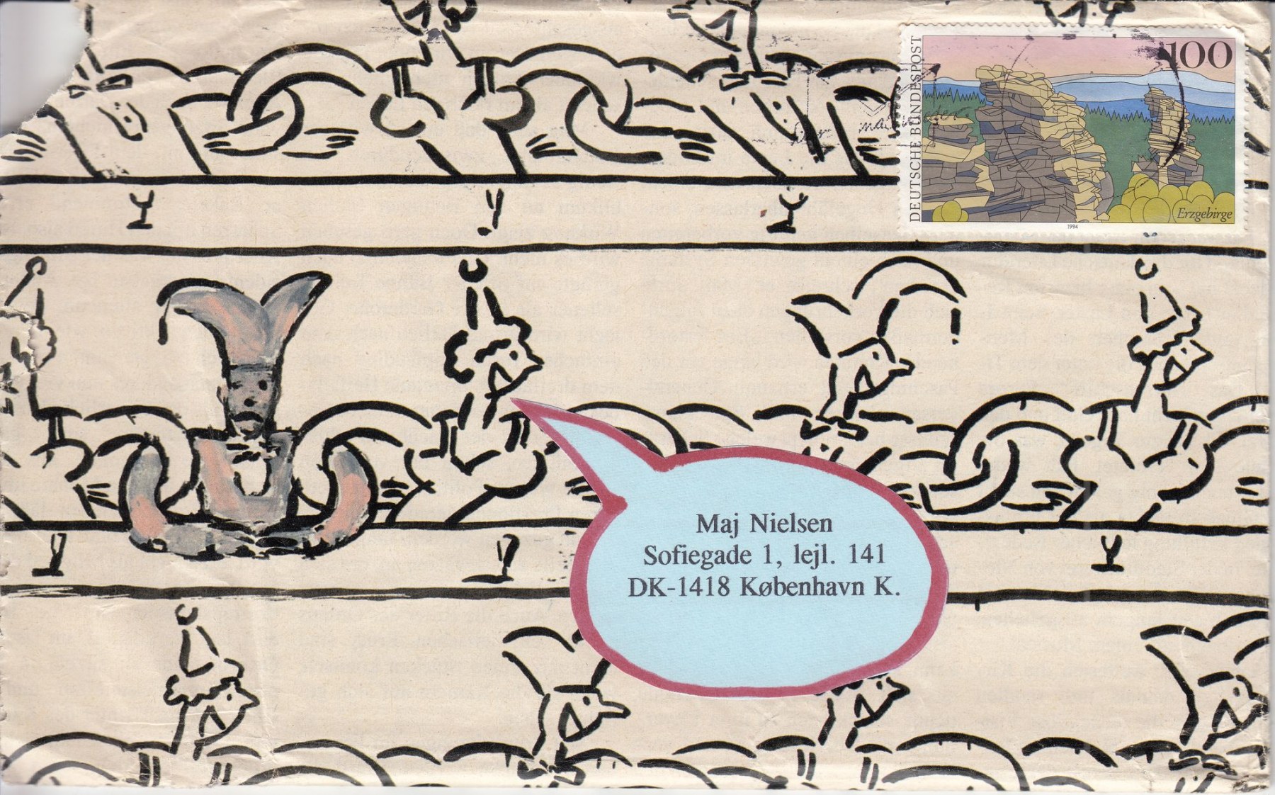 Das hier dargestellte Konvolut „Briefwechsel Berlin – Brüssel / Kopenhagen“ besteht aus einer Auswahl von 52 von mir hergestellten Briefumschlägen. Die Umschläge gehören zu Briefen, die ich frisch verliebt im Zeitraum von August 1995 bis September 1996 an meine damalige Freundin und heutige Ehefrau, Maj Westerfeld, die damals Nielsen hieß, geschickt hatte. Ich lebte schon damals in Berlin und Maj zunächst in Brüssel und später in Kopenhagen.