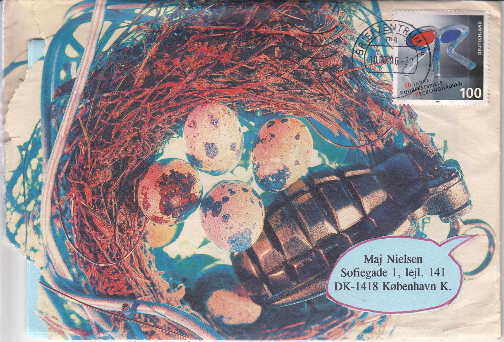 Das hier dargestellte Konvolut „Briefwechsel Berlin – Brüssel / Kopenhagen“ besteht aus einer Auswahl von 52 von mir hergestellten Briefumschlägen. Die Umschläge gehören zu Briefen, die ich frisch verliebt im Zeitraum von August 1995 bis September 1996 an meine damalige Freundin und heutige Ehefrau, Maj Westerfeld, die damals Nielsen hieß, geschickt hatte. Ich lebte schon damals in Berlin und Maj zunächst in Brüssel und später in Kopenhagen.